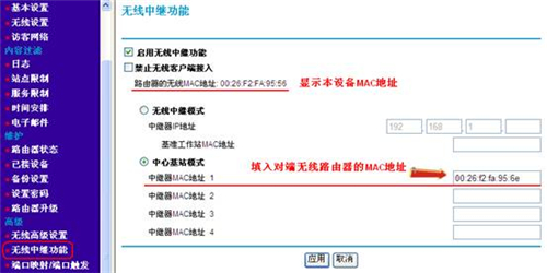 ②选择“无线中继器”模式,在“基站MAC地址”中,填入路由器A的MAC地址;