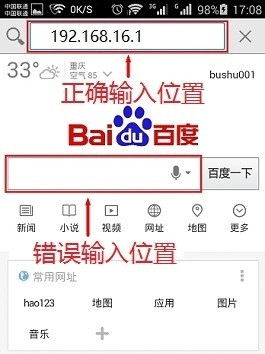 (1)、有些手机浏览器的主页有一个搜索框(百度、360、搜狗、UC等等),很多用户习惯在搜索框中输入192.168.16.1。这里需要说明一下,在搜索框中输入192.168.16.1是错误的,是不能登陆到192.168.16.1页面的。